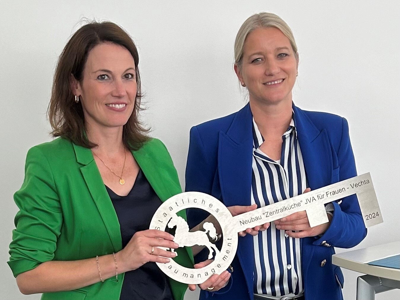 Anschließend reichte Dr. Wahlmann den symbolischen Schlüssel zur Zentralküche an die Anstaltsleiterin und Hausherrin Dr. Katharina Tebben weiter, die allen Beteiligten für die gute Zusammenarbeit bei diesem Projekt dankte: „Mein herzlicher Dank gilt allen Beteiligten des Projekts Zentralküche. Dank Ihres großartigen Einsatzes und der gelungenen Zusammenarbeit haben wir unser gemeinsames Ziel erreicht. Die Zentralküche ist ein großer Gewinn für die JVA für Frauen und ein Bekenntnis zum Vollzugsstandort Vechta.“