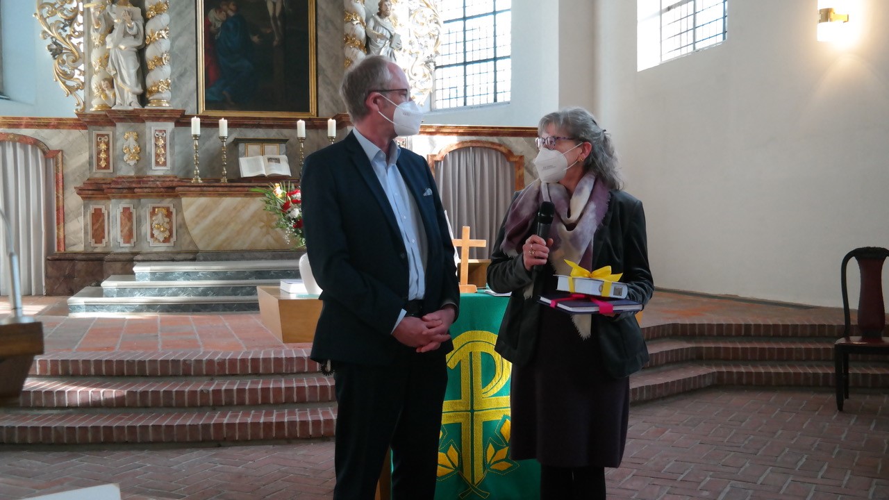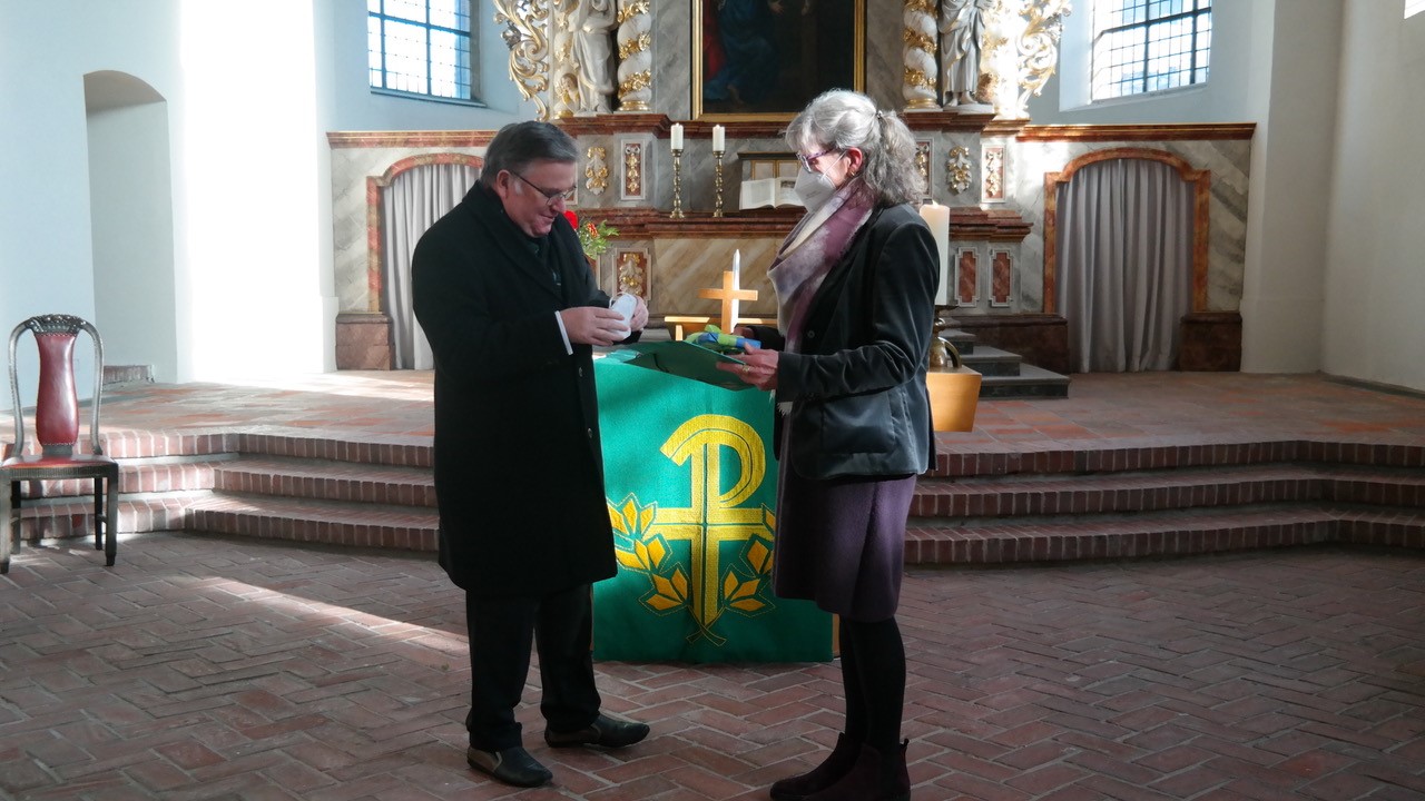 Die Anstaltsleitung ließ es sich nehmen, zu diesem Gottesdienst, der unter Einhaltung der Corona-Bedingungen durchgeführt wurde, auch Propst Michael Matschke einzuladen, der May offiziell entpflichtete. Anstaltsleiter Oliver Weßels überreichte der Ruheständlerin unter anderem ein Abschiedsbuch, das von inhaftierten Frauen und von Bediensteten gemeinsam gestaltet worden ist.