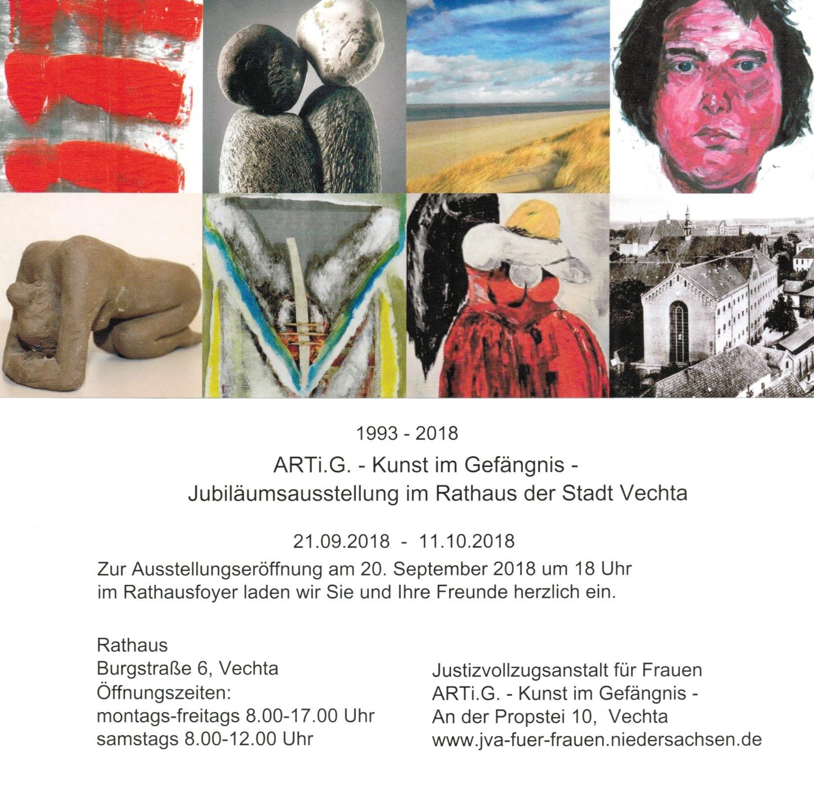 Seit nunmehr 25 Jahren gibt es das Projekt „ARTi.G. – Kunst im Gefängnis" in der Justizvollzugsanstalt für Frauen in Vechta. Anlässlich dieses Jubiläums eröffneten jetzt Vechtas stellvertretende Bürgermeisterin Simone Göhner und die stellvertretende Leiterin der Justizvollzugsanstalt für Frauen, Petra Huckemeyer, eine Sonderausstellung im Vechtaer Rathaus. Diese ist noch bis einschließlich 11. Oktober (Donnerstag) zu den üblichen Öffnungszeiten des Rathauses (montags bis donnerstags, 8 bis 17 Uhr, und freitags, 8 bis 13 Uhr) zu sehen. Der Eintritt ist frei.