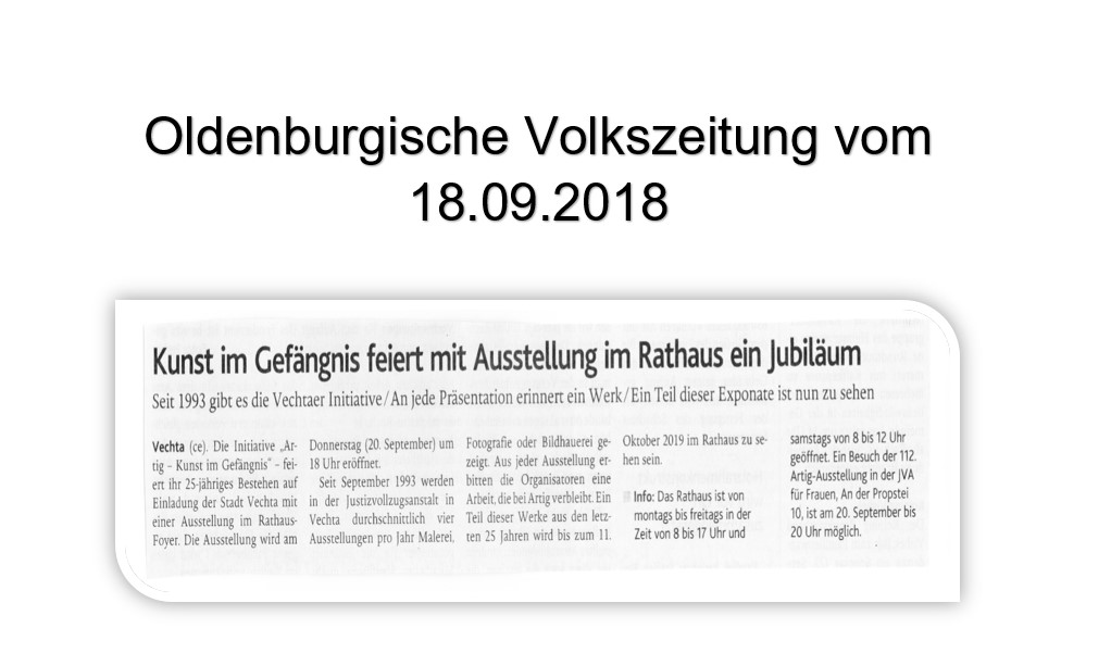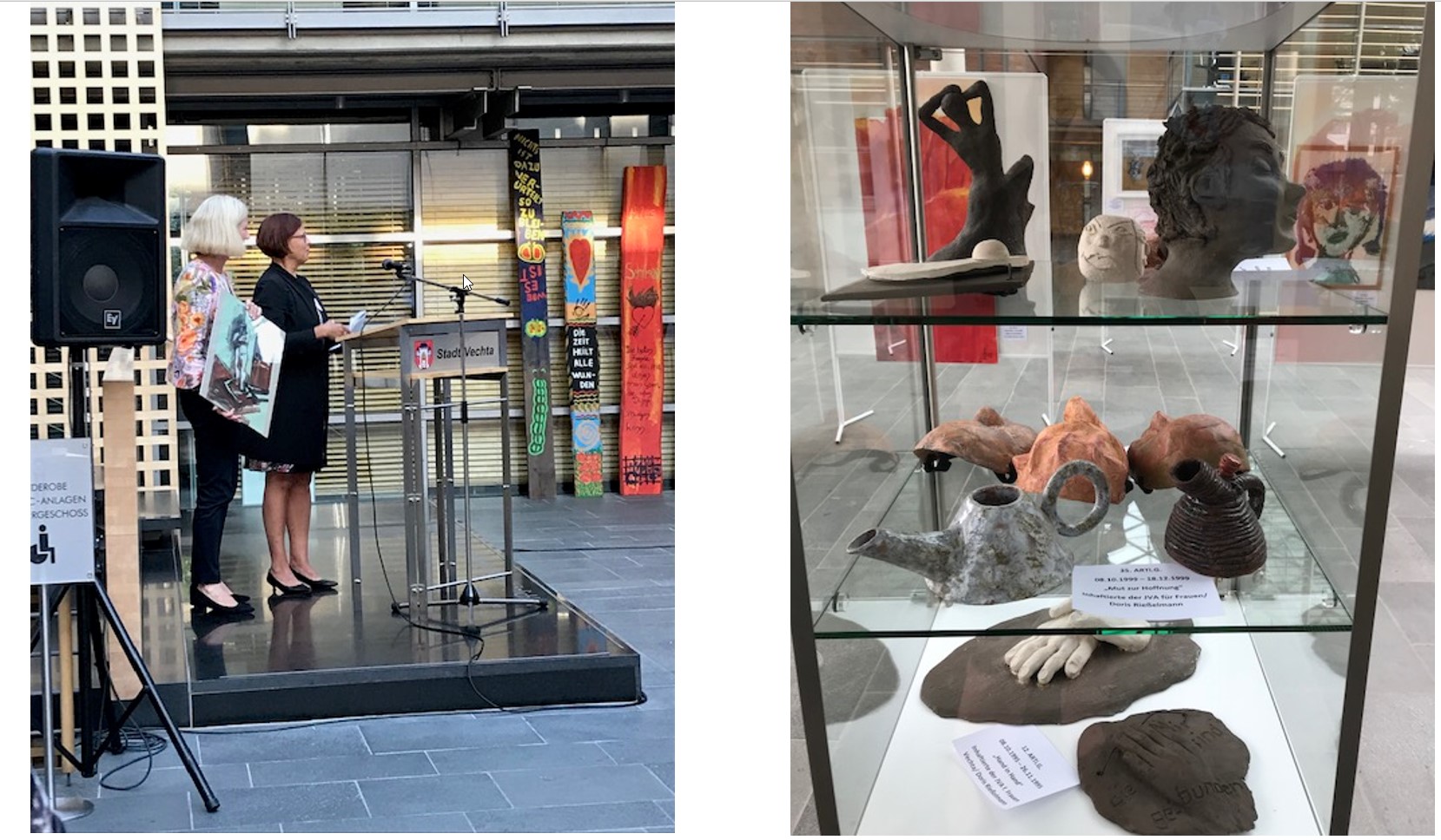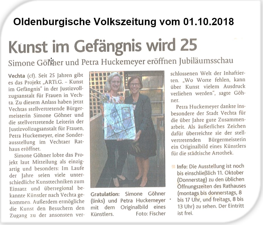 Petra Huckemeyer ging in ihrer Ansprache auch auf die Entstehung des Projekts ein und sagte: „Auf den ersten Blick scheinen Gefängnis und Kunst ein Gegensatzpaar zu sein – in der Frauenhaftanstalt in Vechta ist erlebbar, dass dies keineswegs so sein muss. Der Justizvollzug soll die Inhaftierten dazu befähigen, ein straffreies und sozial-verantwortliches Leben zu führen. Die Atmosphäre eines respektvollen Umgangs, das Zulassen von Kreativität und die Berücksichtigung von Individualität leisten dazu einen wichtigen Beitrag " so Huckemeyer. Sie dankte neben einigen anwesenden Künstlern und Mitarbeitern sowie der Oldenburgischen Landschaft und insbesondere die Stadt Vechta für die über Jahre gute Zusammenarbeit. Als äußerliches Zeichen dafür über-reichte sie der stellvertretenden Bürgermeisterin ein Original-Bild eines Künstlers für die städtische Artothek.
