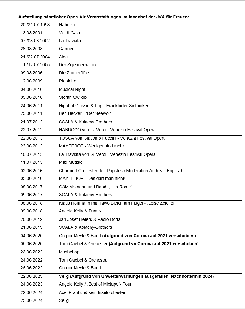 Seit Juli 1998 haben in unregelmäßigen Abständen musikalische Veranstaltungen im Innenhof der JVA für Frauen stattgefunden.