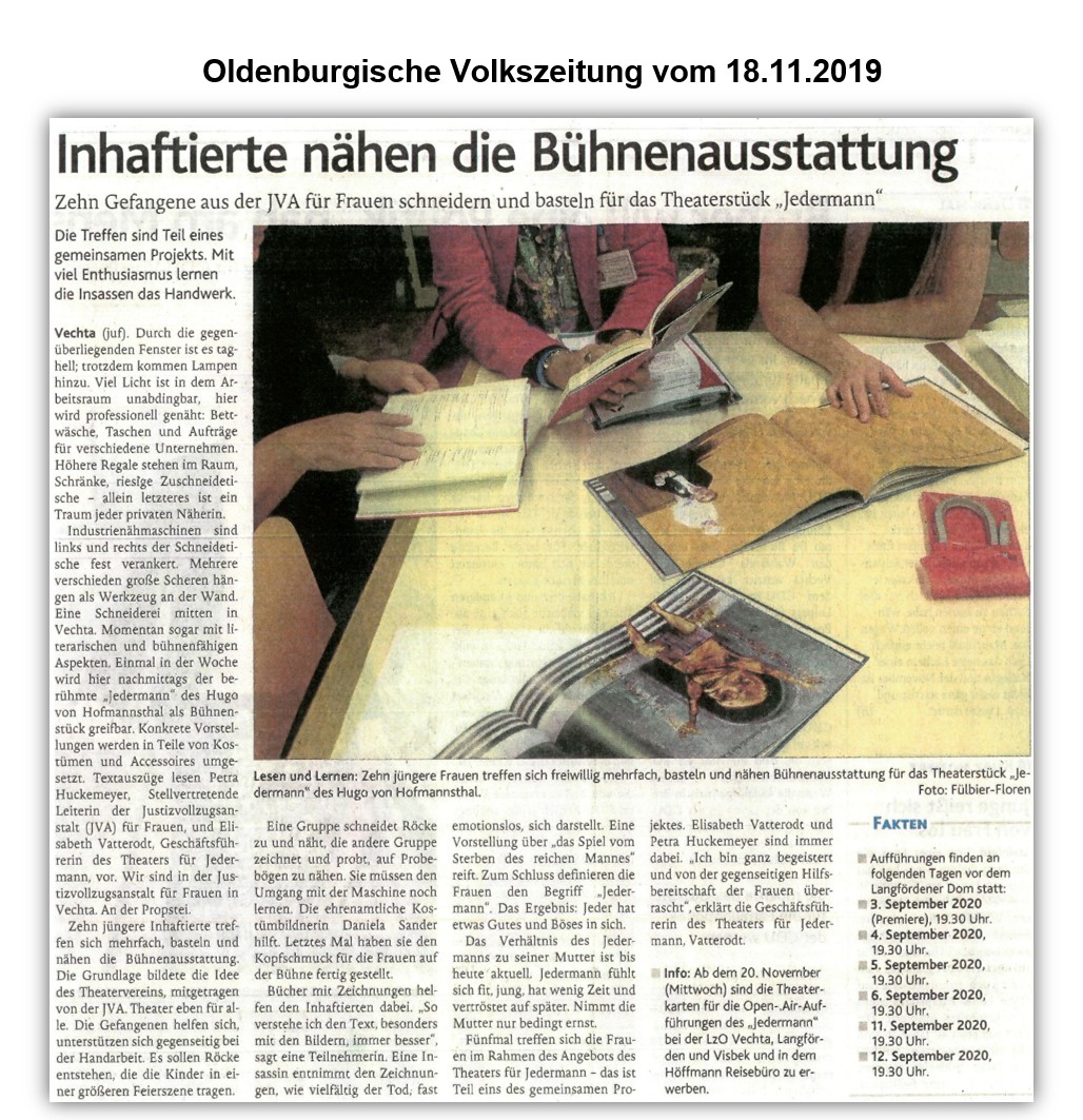 Auf jeden Fall wird es innerhalb des Vollzuges ein eigenes JEDERMANN-Projekt geben. Die beteiligten Inhaftierten erhalten neben der handwerklichen Tätigkeit die Gelegenheit, sich auch inhaltlich mit dem Stück zu befassen und sich mit der Frage nach der persönlichen Betroffenheit auseinandersetzen können. Die JVA für Frauen betritt mit dieser völlig anderen Projekt-Form neue Wege und ist mit den beteiligten Inhaftierten und Bediensteten stolz darauf, ein kleiner Teil der Inszenierung 2020 zu sein zu können.